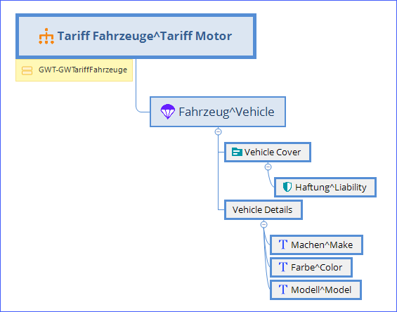 In a German/English mind map, the product line name appears first in German (Tariff Fahrzeuge) and then in English (Tariff Motor):