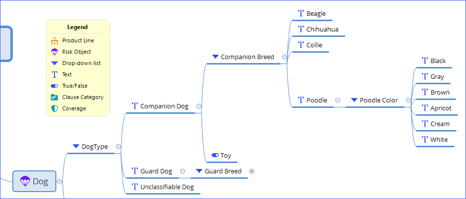 A drop-down list can have Text, Number, Money, and Decimal attributes. Beneath any of these list items, you can attach data type attributes, such as Text, Drop-down list, and Number, among others. If you attach a drop-down list, you can continue attaching attributes on the list items. This relationship is preserved when you import the product to PolicyCenter.