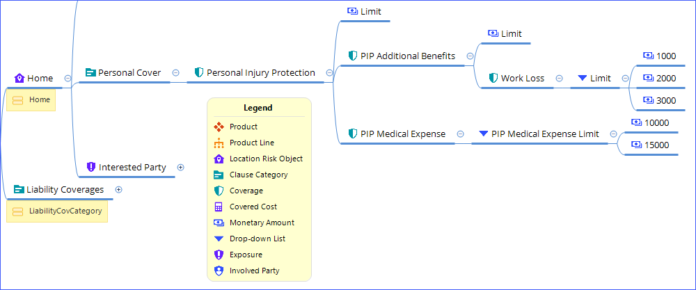 The following mind map shows a Personal Injury Protection coverage that is a parent to PIP Additional Benefits and PIP Medical Expense Limit coverages. The child coverages are nested directly underneath the Personal Injury Protection coverage. The PIP Additional Benefits coverage has a Work Loss child coverage.
