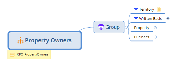 The following illustration shows a mind map in XMind for a property owners line. Property Owners line has a Group risk object. The children of Group are Territory drop-down list, Written Basis drop-down list, Property attribute, and Business attribute.
