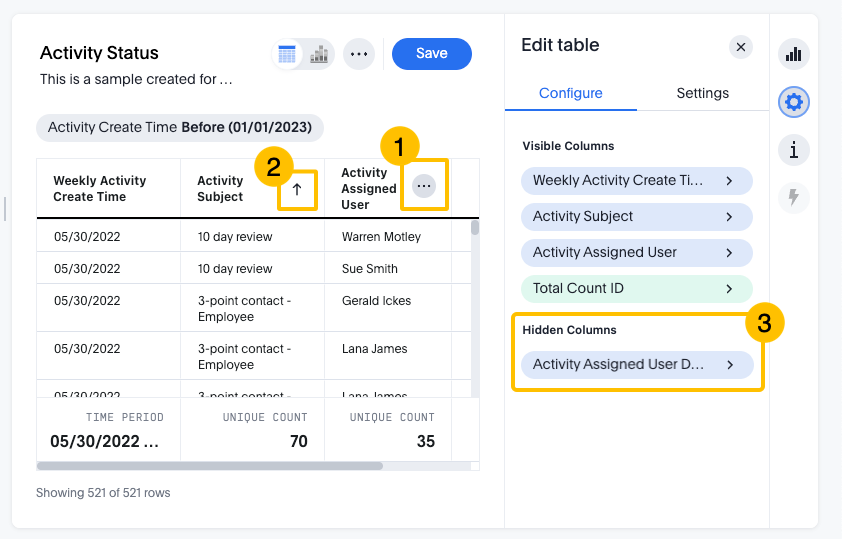 - You can sort by a column in ascending or descending order. Hover over the column name and select the More ellipsis, then select Sort.