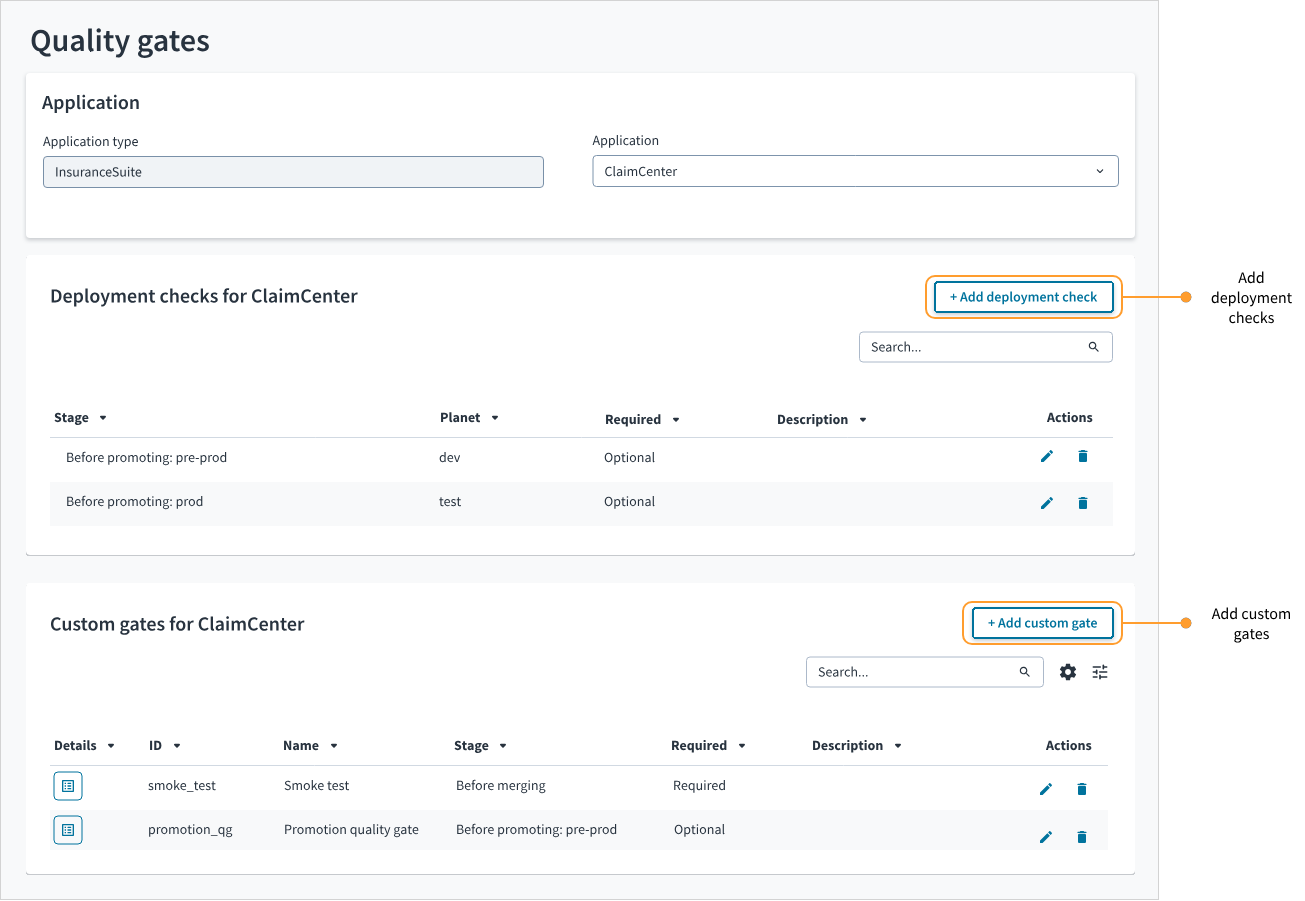 In the Quality Gates app, you can add deployment checks for InsuranceSuite apps. Deployment checks are default quality gates that allow you to check before the build promotion if the deployment of an InsuranceSuite app was successful. You can also use CI/CD Manager API to manage the deployment checks and override their verification statuses.