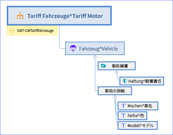 ドイツ語/英語のマインドマップでは、保険商品種目名は最初にドイツ語で(Tariff Fahrzeuge)、次に英語で(Tariff Motor)表示されます。