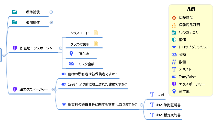次の図は、包括賠償責任における保険商品種目のエクスポージャーを示しています。保険商品種目のエクスポージャーは、所在地エクスポージャーと鉛エクスポージャーの 2 種類があります。所在地エクスポジャーにはクラスコード、クラスの説明、所在地、およびリスク額のフィールドが含まれます。クラスコードとクラスの説明は参照テーブルのため、マインドマップには実装されません。鉛エクスポージャーには 2 つの正誤問題および、関連情報収集用のドロップダウンリストが 1 つ含まれます。