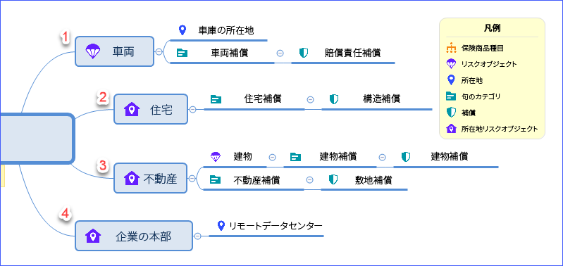 マインドマップで、各リスク属性のトピックを作成し、これらのトピックをリスクオブジェクトに付加します。また、これらのトピックを共通のリスク属性のカテゴリトピックの下にまとめることもできます。 例えば、保険契約の属性サブトピックを保険商品種目に追加し、リスク属性のカテゴリ