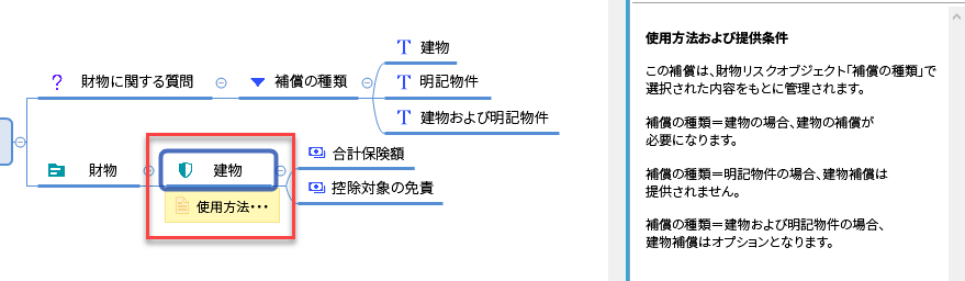 次のマインドマップでは、建物補償がある保険商品種目をモデル化しています。建物補償の提供条件は補償の種類ドロップダウンリスト属性によって制御されます。