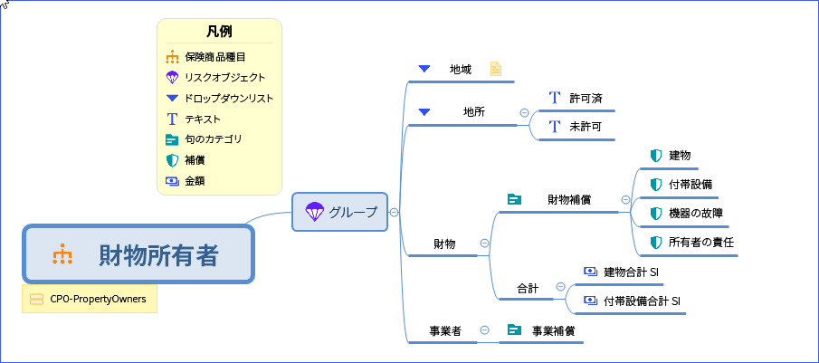 次の XMind のスクリーンショットは、保険商品種目、リスクオブジェクト、補償、属性、および保険商品の他の部分を識別する Guidewire マーカーがある保険商品種目を示しています。これらのマーカーは、マップのインポート時に Advanced Product Designer アプリで使用する情報を提供します。
