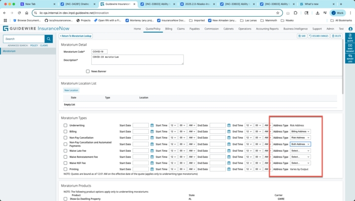 リスク住所に基づいて請求支払猶予を追加できます。(以前のリリースでは、すべての請求支払猶予は請求先住所のみに基づいていました)。この改善により、請求支払猶予をより正確に制御できます。[Quote/Policy] > [Moratorium Maintenance]のリストから、請求先住所、リスク住所、またはその両方の住所を選択するようになりました。