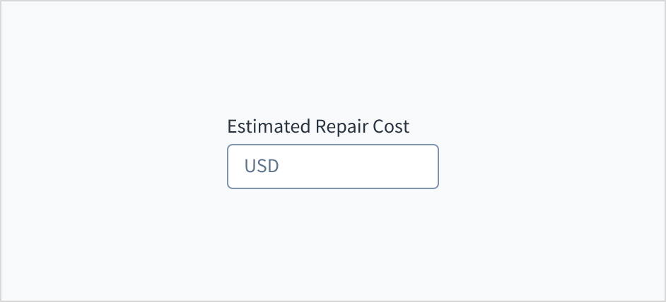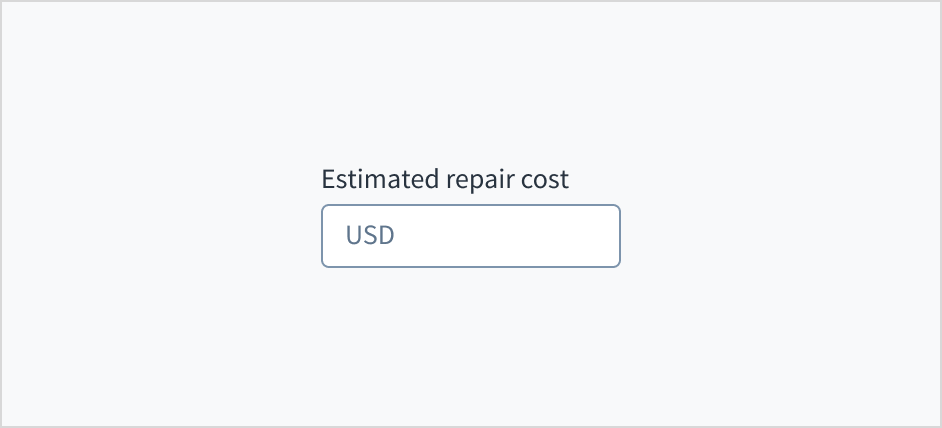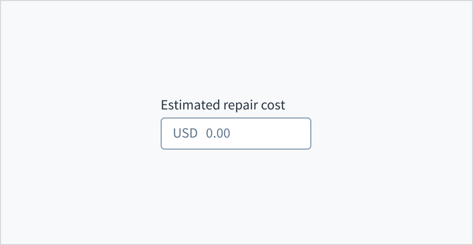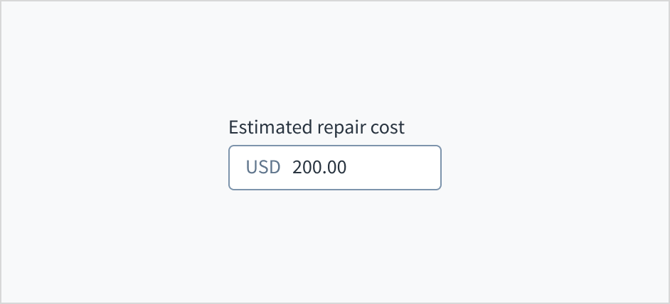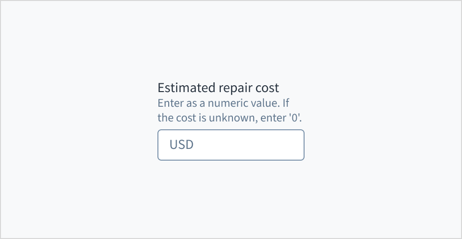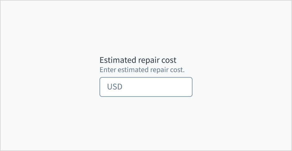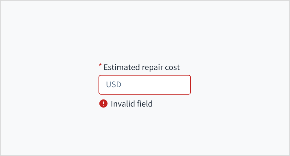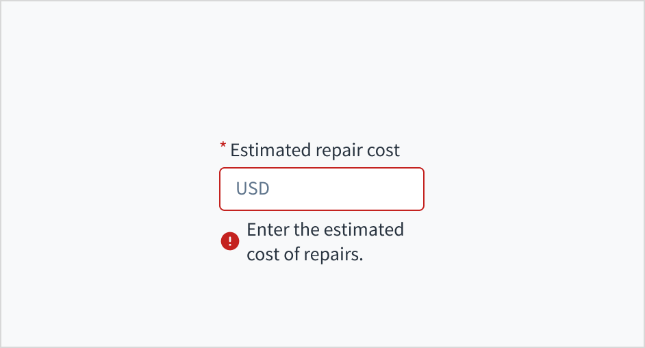 Error message text tells a user how to fix the error. For currency input fields, errors are often related to validation issues that must be fixed. For example, in a claims submission process where a user doesn't fill out a required field for estimated repair cost, you could use error text like "Enter the estimated cost of repairs."
