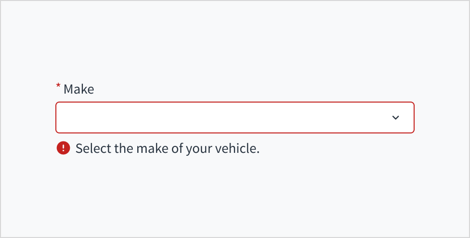 Error message text tells a user how to fix the error. In the case of the dropdown, errors are often related to something that must be fixed for in-line validation. For example, if someone doesn't select an employment status and this is a required field, you can use error text to guide the user to a solution: “Select an employment status.”