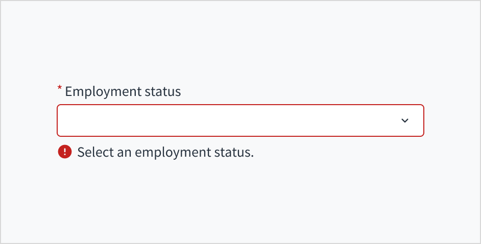 Error message text tells a user how to fix the error. In the case of the dropdown, errors are often related to something that must be fixed for in-line validation. For example, if someone doesn't select an employment status and this is a required field, you can use error text to guide the user to a solution: “Select an employment status.”