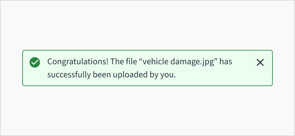 Success messages inform users that a task or action has been completed successfully. For frequent and simple actions, such as uploading a file or saving a document, keep the success message short and practical. You can use a celebratory tone for significant achievements and messages that are more infrequent in nature.