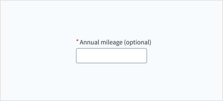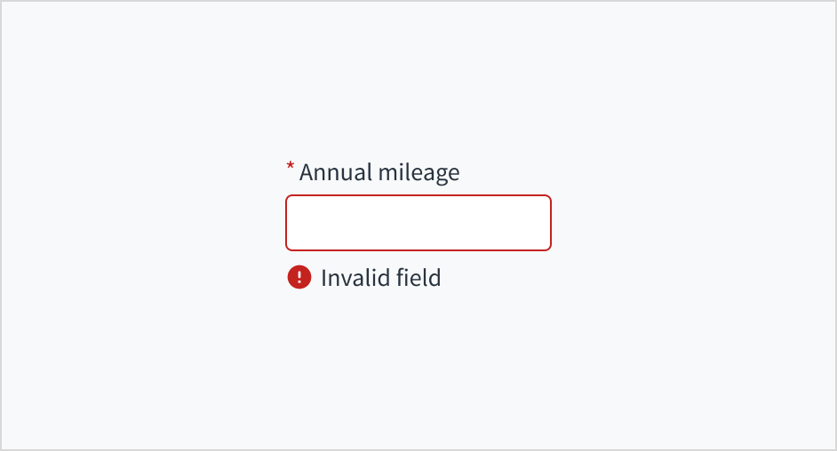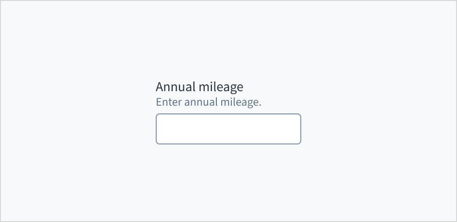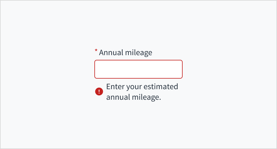Error message text tells a user how to fix the error. In the case of the number input field, errors are often related to something that must be fixed for in-line validation. For example, if the user doesn't fill out a required field that asks for their estimated annual mileage, you can use error text to guide them to a solution: “Enter your estimated annual mileage.”
