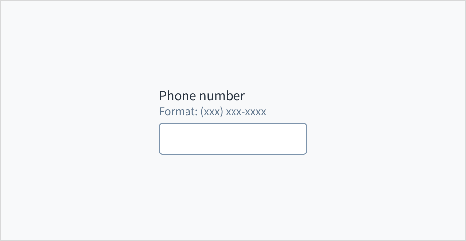 Don't put placeholder text in the phone entry field. Placeholder text strains users' short-term memory because it disappears once a value is entered. It also poses additional burdens for users with visual and cognitive impairments.