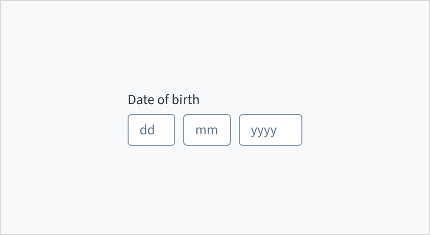 The date input combines three distinct input fields - day, month, and year - into a single date component. Users enter dates unrelated to the current date, such as birth dates, using this component.
