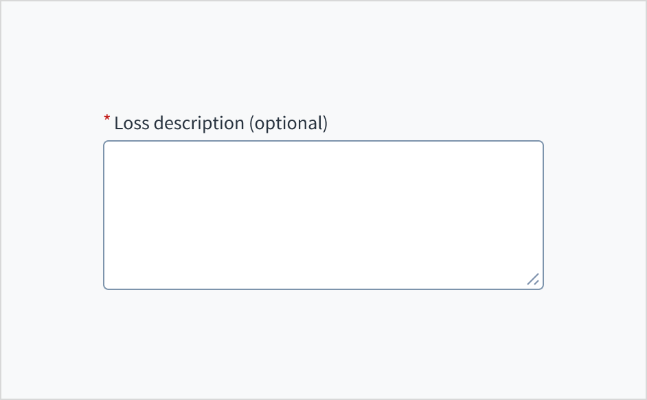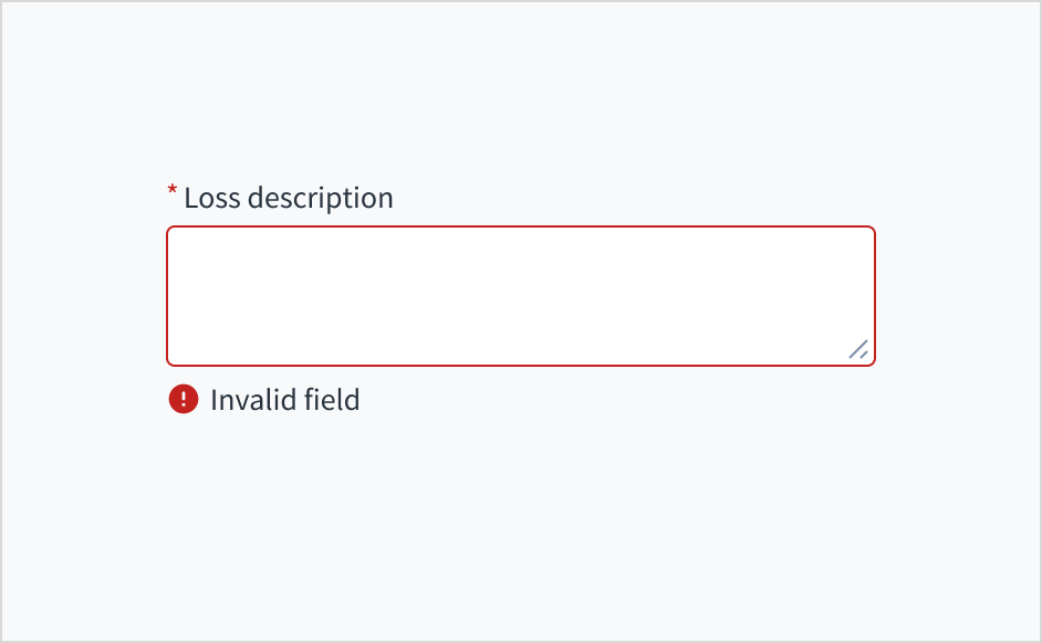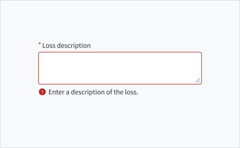Error message text tells a user how to fix the error. In the case of the text area field, errors are often related to something that must be fixed for in-line validation. For example, if the user doesn't fill out a required field that asks for a description of their loss, you can use error text to guide them to a solution: “Enter a description of the loss.”