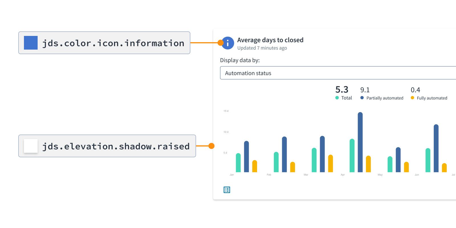 For instance, a button that uses the color token jds.color.background.brand will be consistent with all other elements that use it or a related token. If you change the theme to use a different brand color, all of those elements will automatically update.