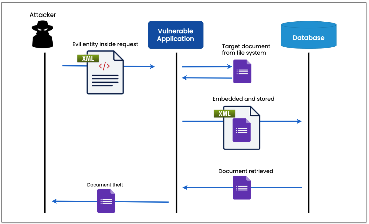 The attacker includes a short DTD into the document to define the "file" external entity, which references a configuration file local to the vulnerable application. After evaluating the XML document, the configuration file's contents are included inline as a field. Because the evaluation of entities occurs within the XML parser, the application processing this request cannot determine that the attacker provided the content as a literal string in the field. As a result, the attacker can retrieve their previously submitted user profile information containing the extracted file data.