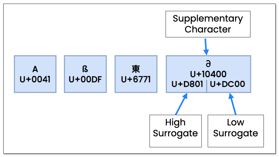 Therefore, a char value can only represent BMP code points, including surrogate code points or units of the UTF-16 encoding. For example, the UTF-16 encoding of characters like the capital letter 'A', the German "eszett" or "sharp S" (ß), the Han character 東 (meaning "east"), and the Deseret capital letter long I (𐐀) demonstrate how different characters are represented in UTF-16.
